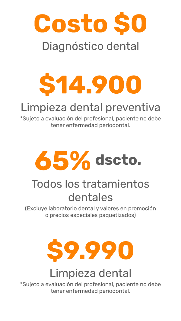 • Limpieza dental incluye destartraje supragingival y profilaxis. Limpieza válida para pacientes mayores de 12 años. El paciente no debe tener enfermedades periodontales.
